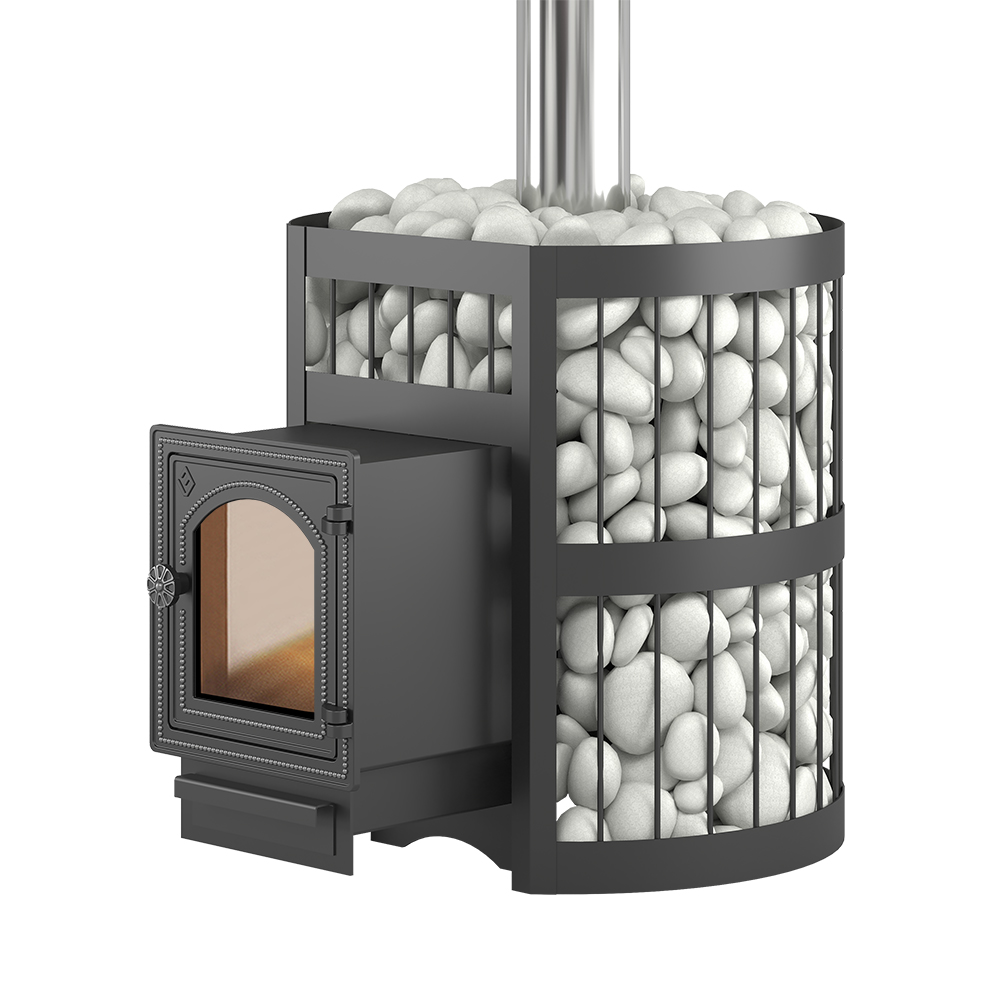 Чугунная банная печь ЭТНА 18 (ДТ-4С ) рассчитана на работу в парной объёмом до 18 м3. Цельно литая чугунная дверца сохраняет свою форму при нагревании. Крепление дверок к топочному тоннелю – болтовое, позволяет снимать и заменять дверку. Сетка для камней сделана в виде корзины из стального прутка диаметром 6 миллиметров. Три кольца из стальной полосы толщиной 2 миллиметра придают сетке дополнительную прочность и улучшают внешний вид. Сетка изготовлена из конструкционной стали. По всей высоте в сетку укладываются камни для бани. Заклад обеспечивает работу открытой каменки, а также равномерно распределяет тепло в пространстве парной, а так же защищают парящихся от жёсткого инфракрасного излучения. Кожух диаметром 560 миллиметров вмещает в себя до 120 килограммов камней крупной и средней фракции.