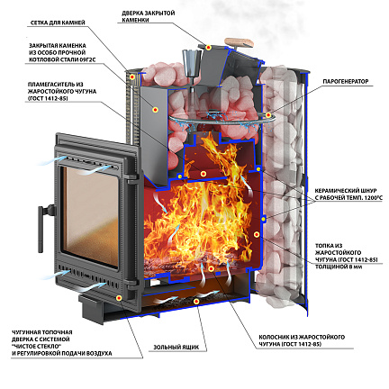 Закрытая каменка изготовлена из стали и вмещает в себя не менее 30 кг камней.