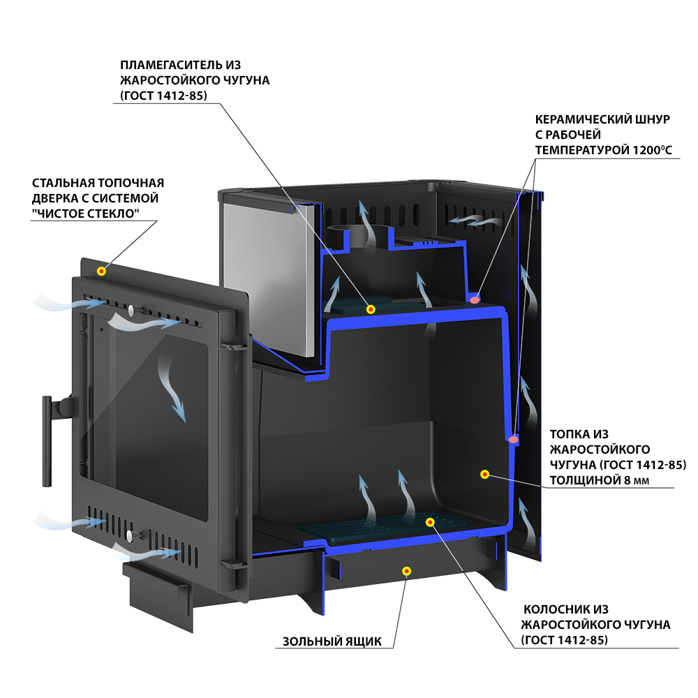 Преимущество печи в том, что топка печи состоит из 3-х элементов. На стыке между ними используется керамический шнур с рабочей температурой 1200 градусов. То есть топка печи абсолютно герметична!