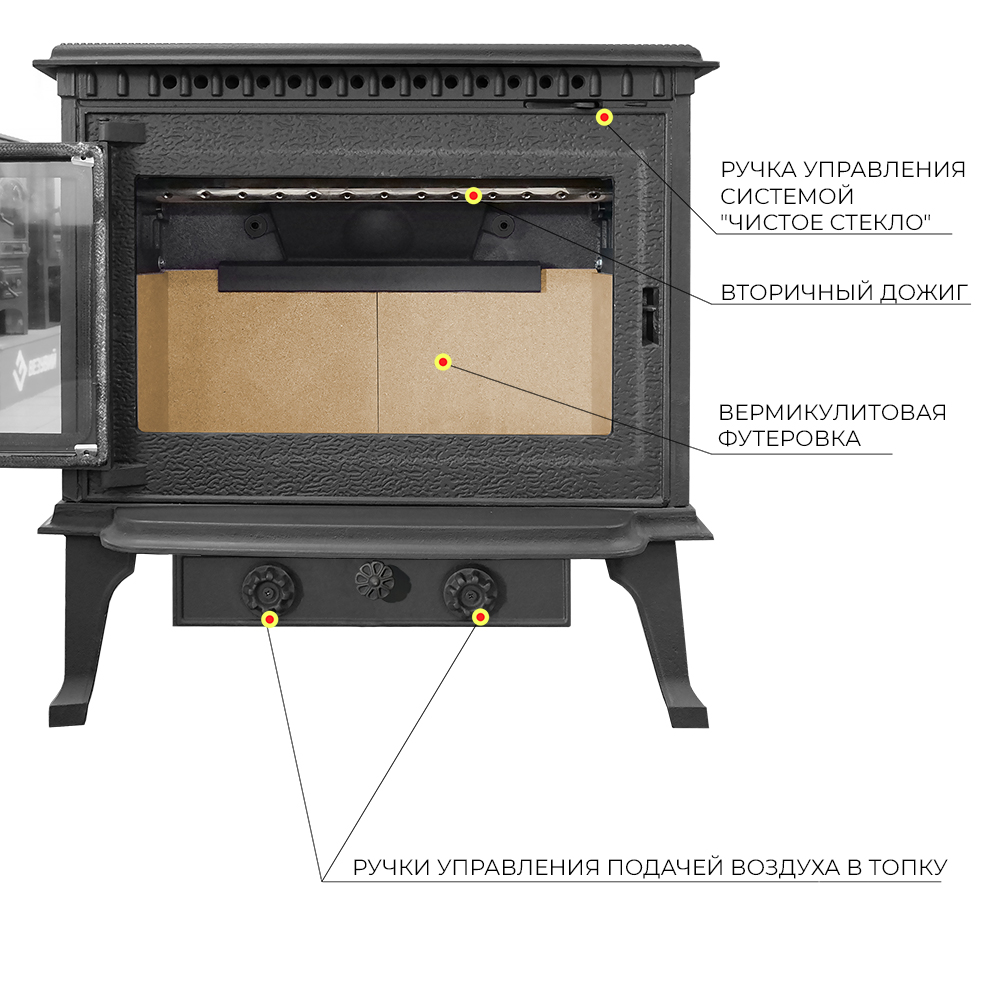 Над дверцей печи-камина расположена система чистое стекло, которая помогает оставаться стеклу чистым.