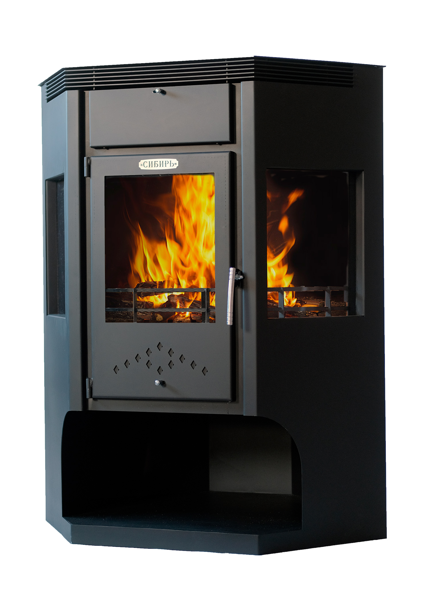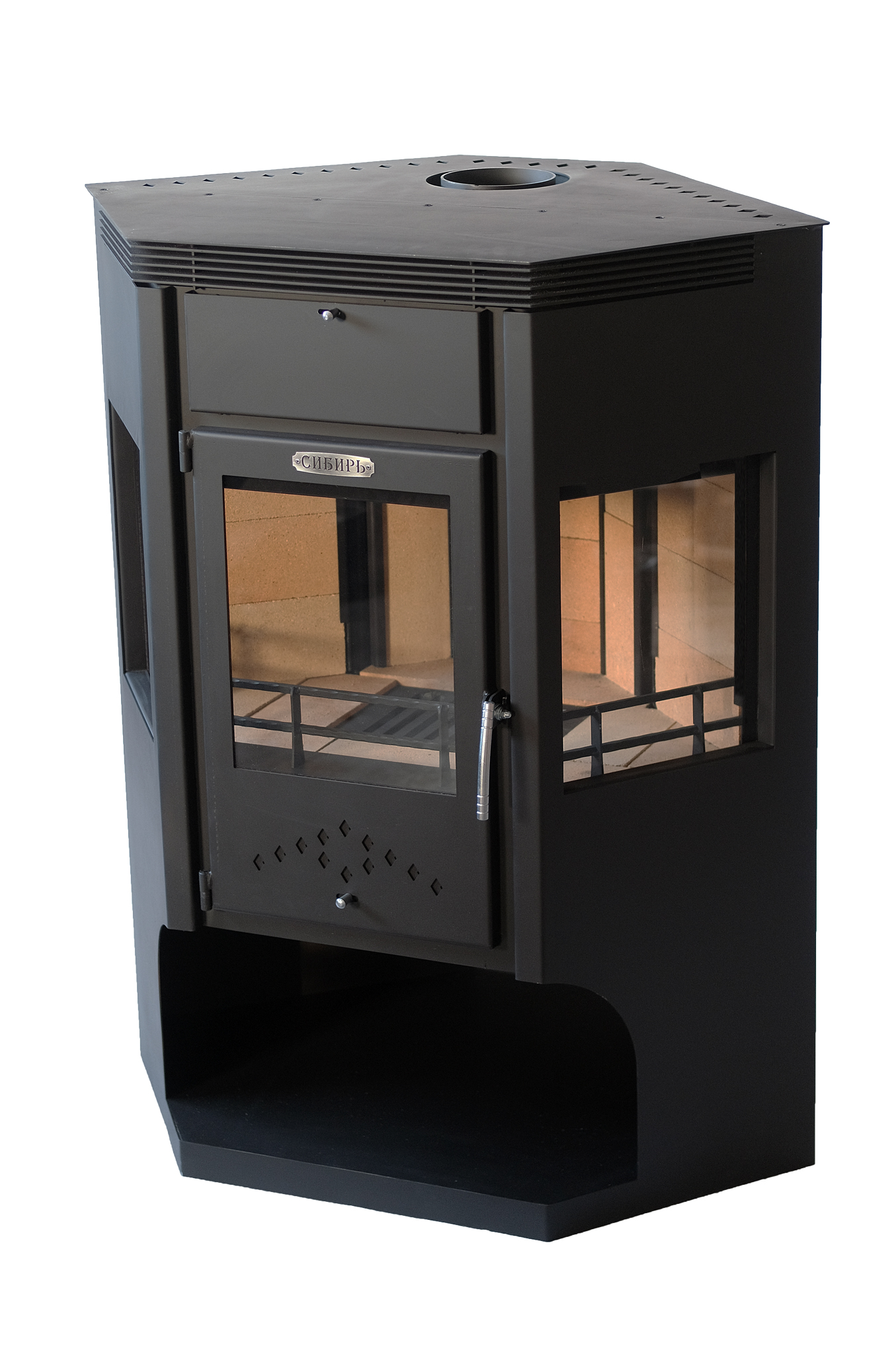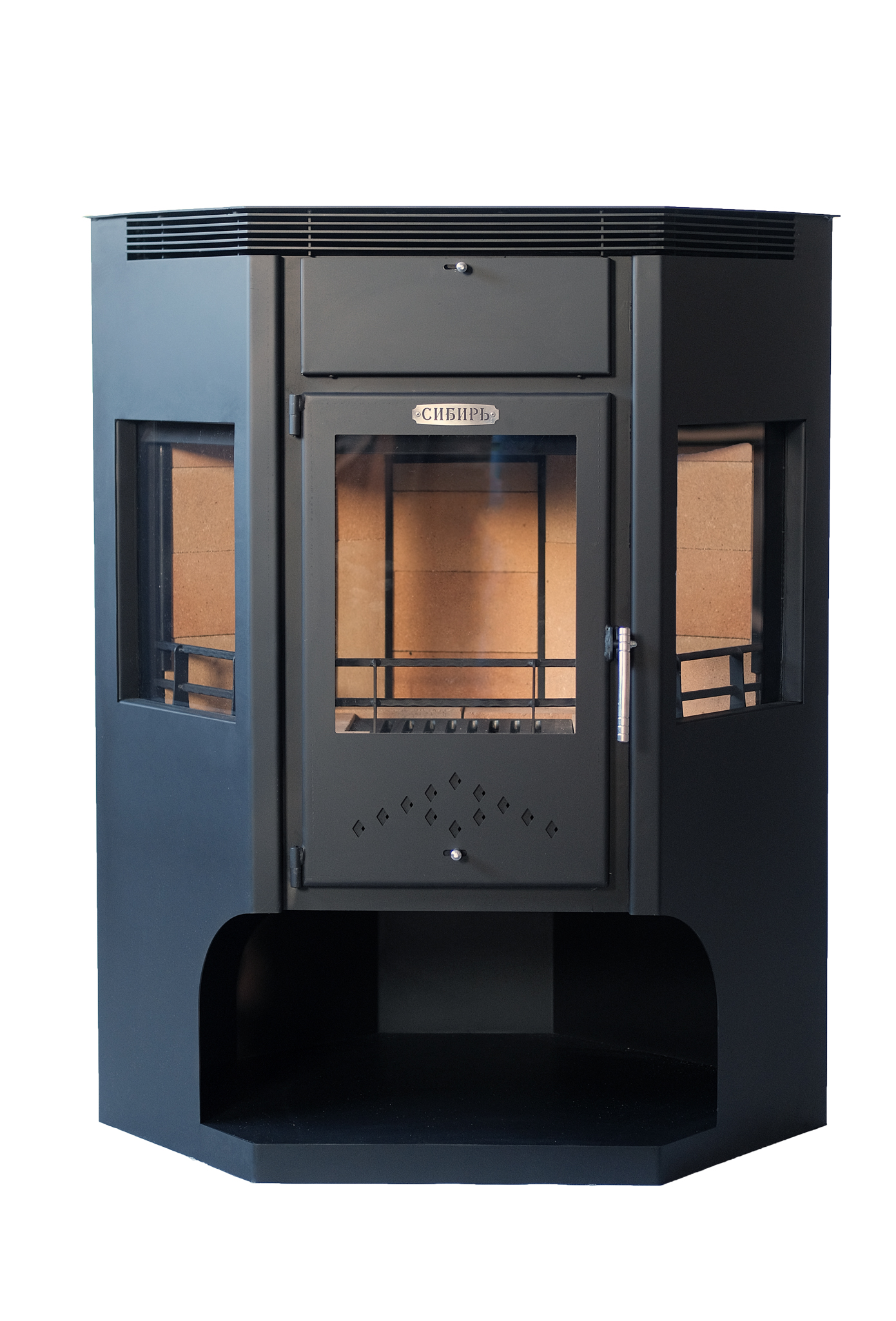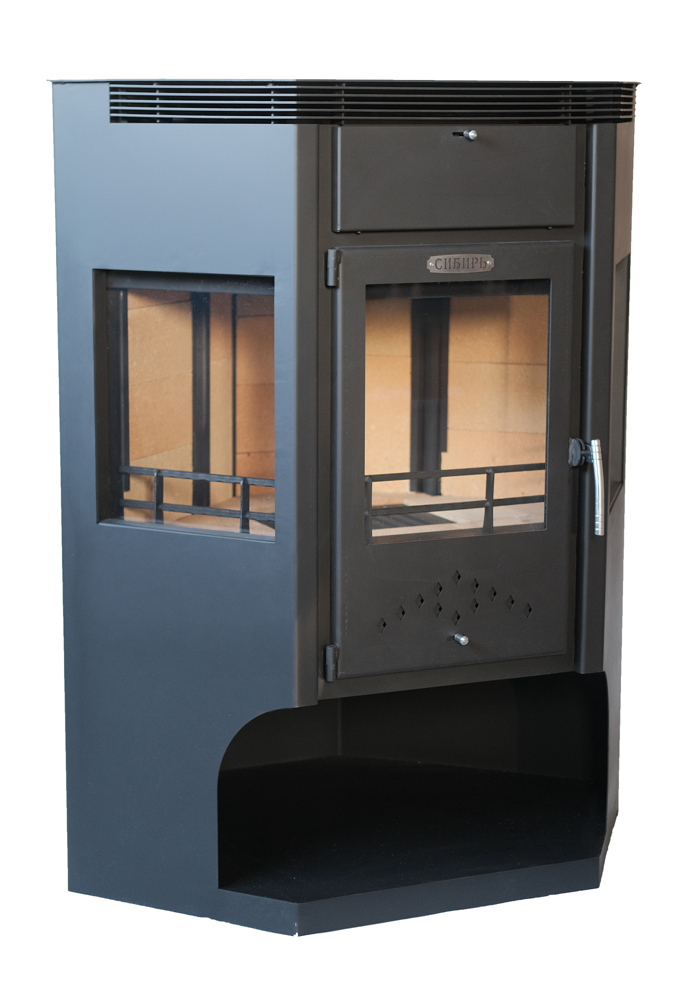 В конструкцию печи-камина "Сибирь" - 15 кВт внедрена доработанная система дожига вторичных газов, позволяющая увеличить КПД камина и скорость нагрева отапливаемого помещения.