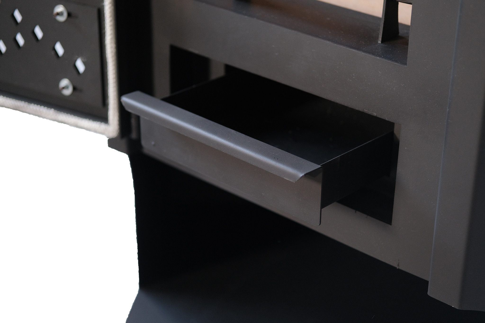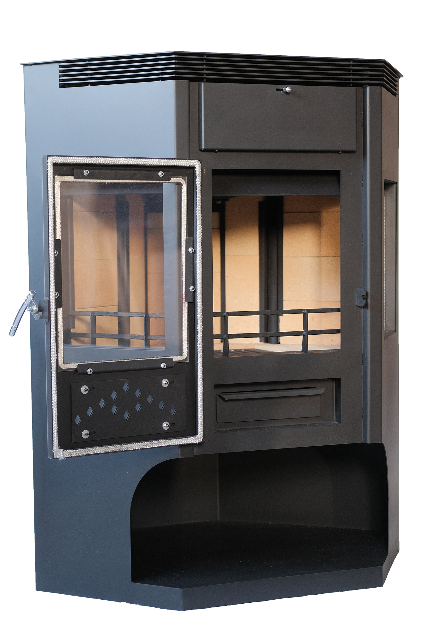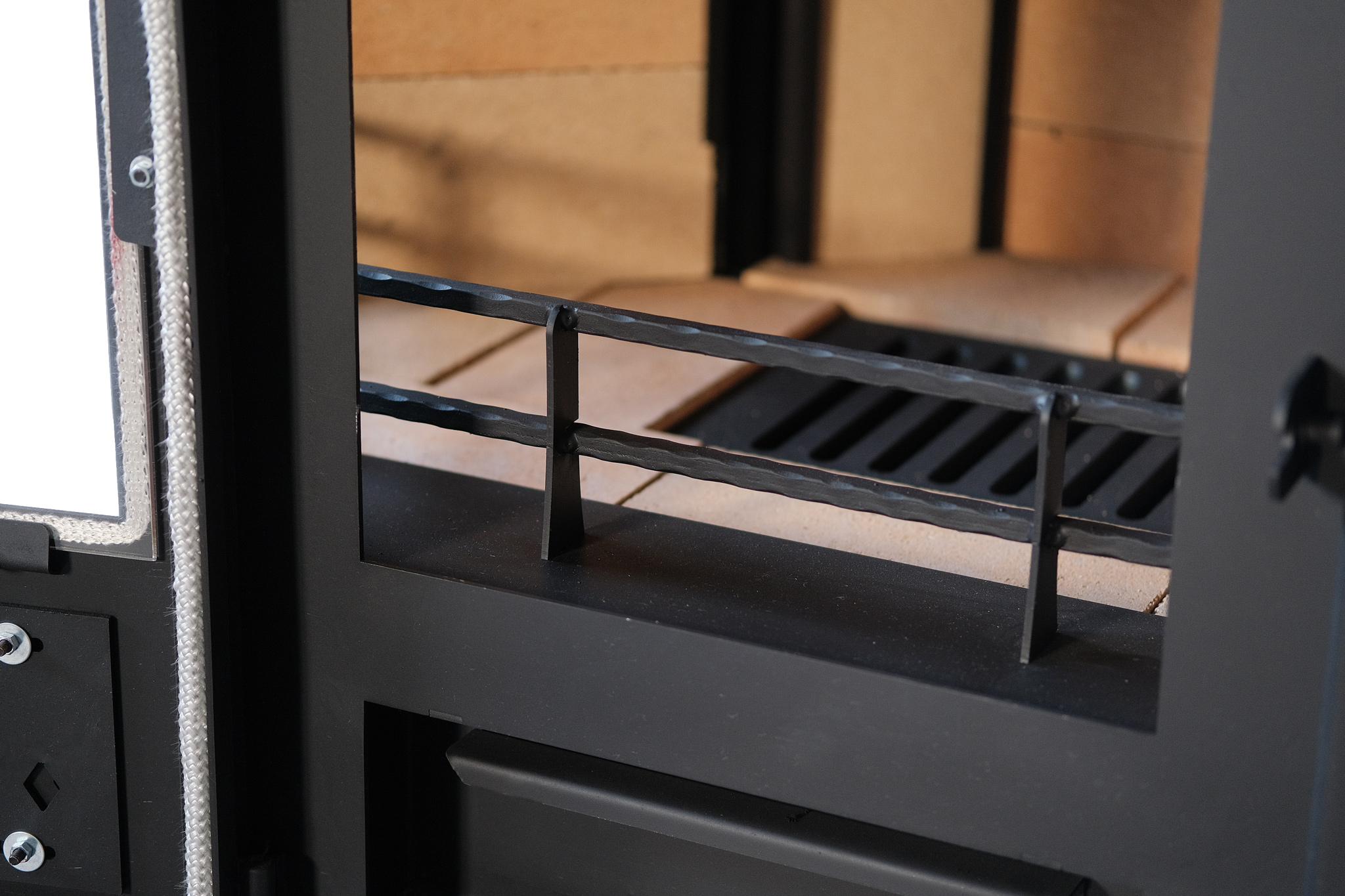 - Система ограждения для дров позволяет компактно размещать поленья внутри топки, защищая тем самым панорамное стекло от механических воздействий;