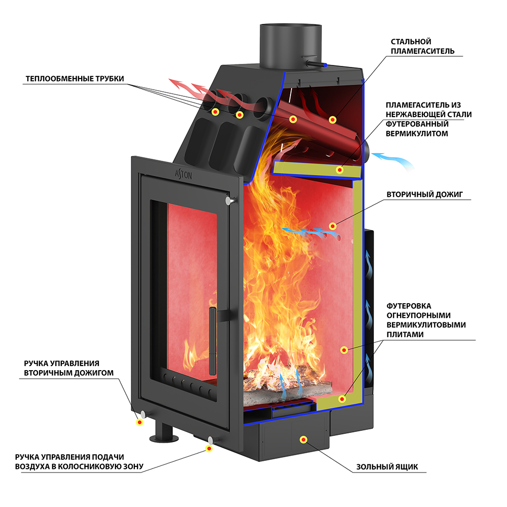 Максимальная теплоёмкость топки обеспечивается наличием вермикулитовой облицовки внутри топочного пространства. Вермикулит хорошо набирает энергию во время горения дров и постепенно и равномерно отдаёт тепло после окончания горения. Также вермикулит защищает стальные стенки топки от прогорания и перегрева даже при сильном горении топлива