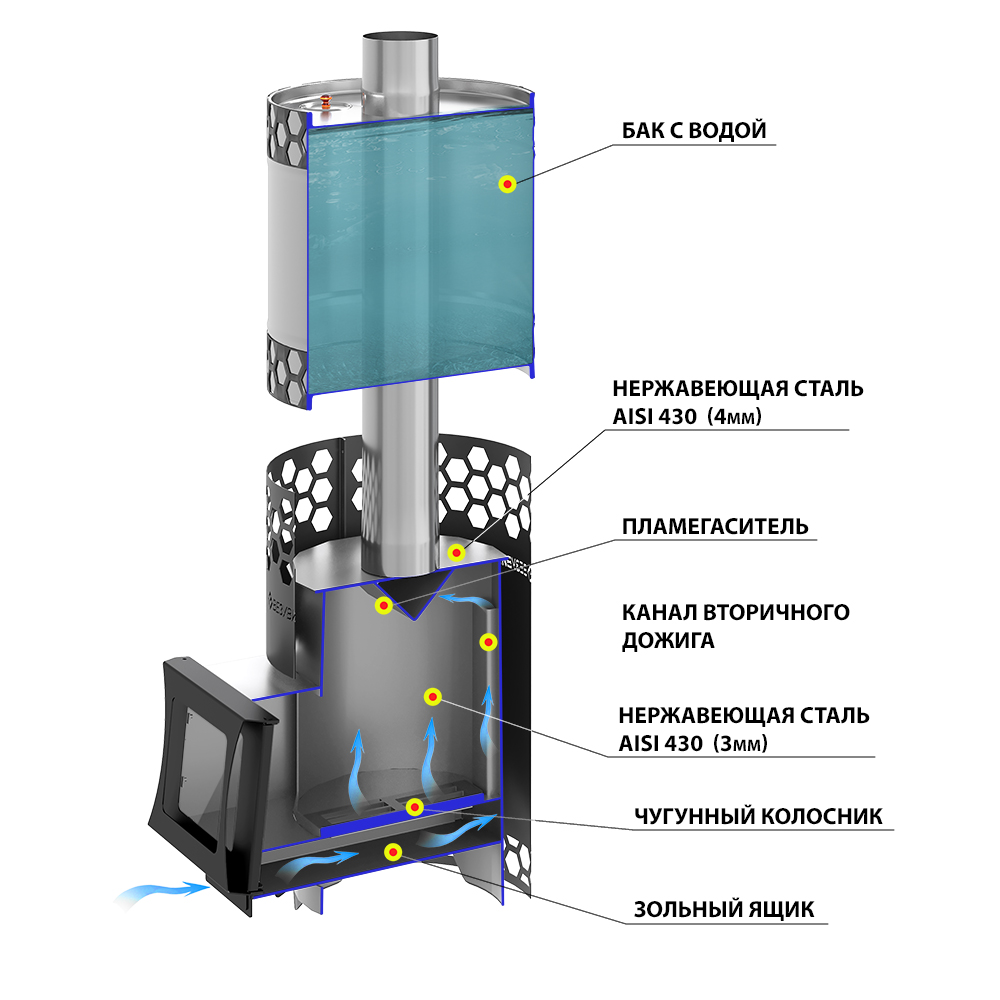 Печь сделана из нержавеющей стали AISI 430 с толщиной стенок от 3 до 4 мм.